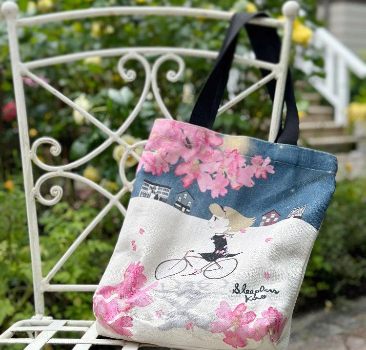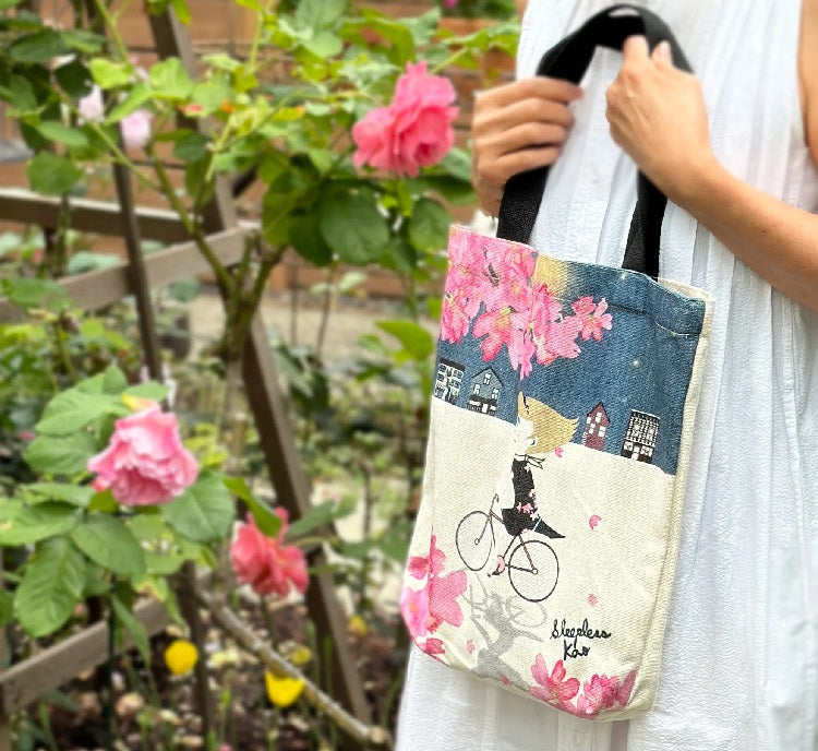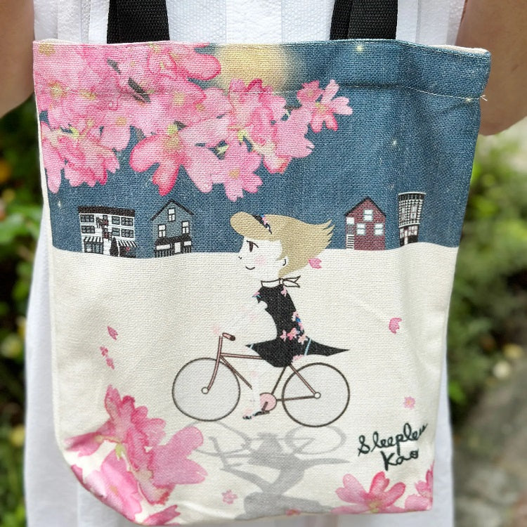 Nikkei National Museum ShopA whimsy and romantic design tote bag by Sleepless Kao. With plenty of space and a strong handle, it is suitable for many occasions! Let your imagination take flight as you pedal through the moonlit streets, surrounded by the soft glow of cherry blossoms. This tote promises a nocturnal journey like no other.