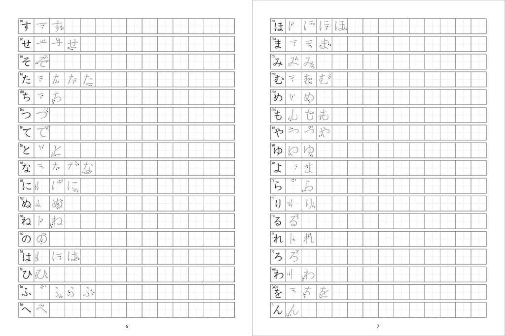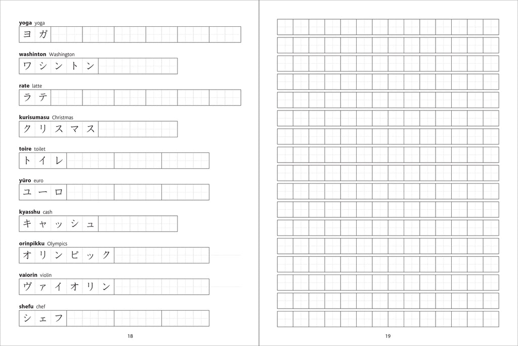 The workbook includes over 100 pages of blank grids for handwriting practice, as well as a few pages of useful writing practice exercises showing examples of each Hiragana and Katakana character in everyday words.